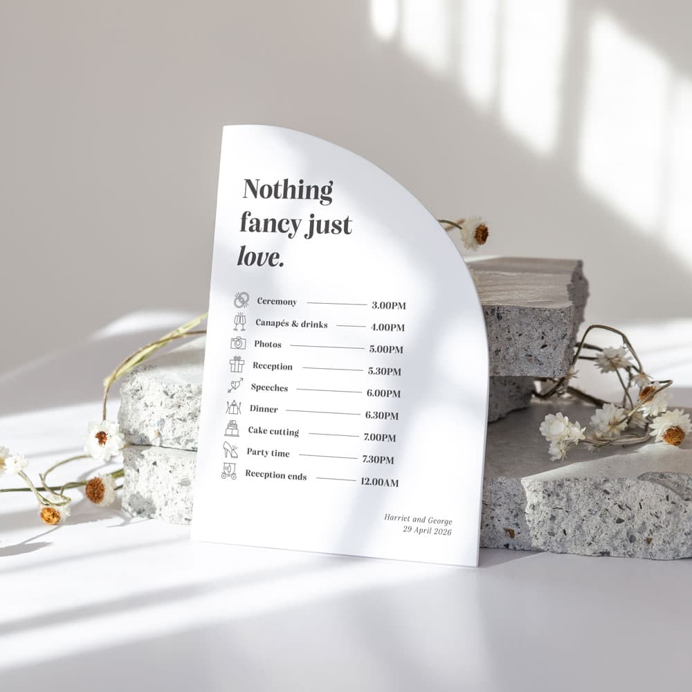 This timeline of your day will help explain what’s happening and when, while also being customisable with any text or timings you’d like. It’s a simple solution to easing the minds of wedding guests arriving at your big day.